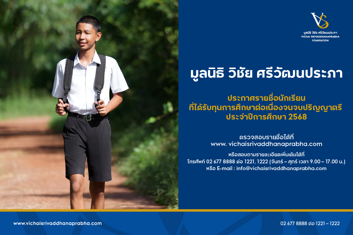มูลนิธิ วิชัย ศรีวัฒนประภา ประกาศรายชื่อผู้ได้รับทุนการศึกษา รุ่นที่ 6 ประจำปีการศึกษา 2568
